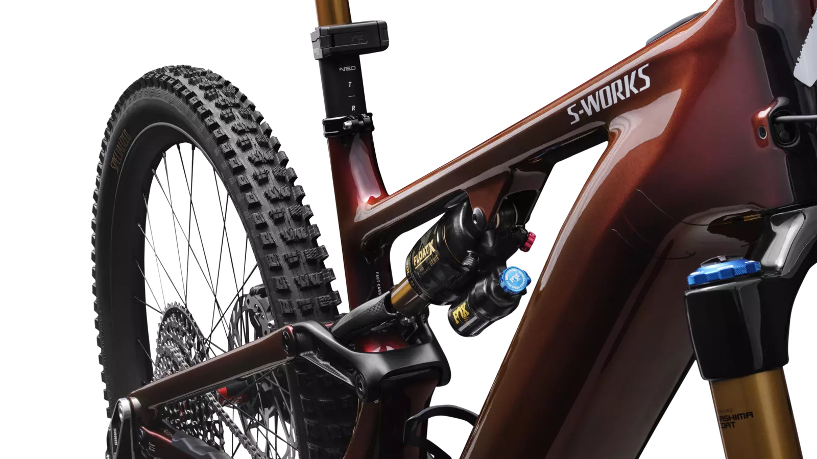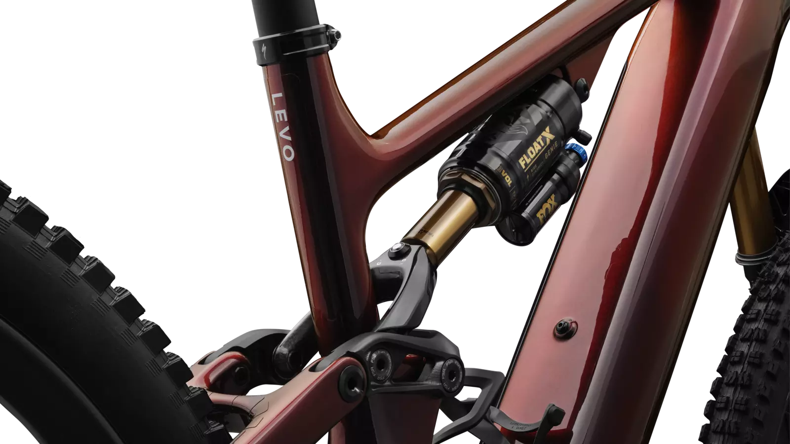 All new S-Works Levo 4 frame with carbon shock extension, FACT 11m carbon chassis and rear-end, 12x148mm dropouts, sealed cartridge bearing pivots, SRAM UDH compatible, w/ SWAT storage, 150mm of travel, side entry battery, fork travel up to 180mm